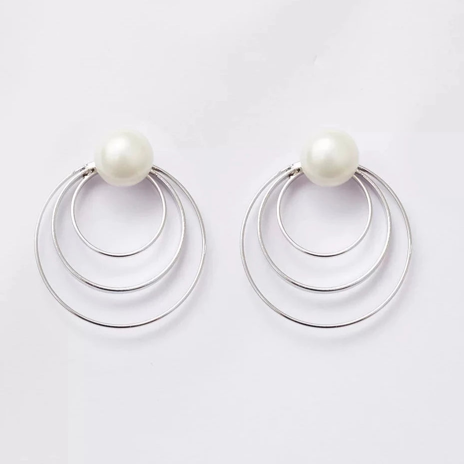 These stunning earrings boast a beautiful design, with their base adorned with lustrous shell pearls and three hoops of varying sizes plated in white rhodium.