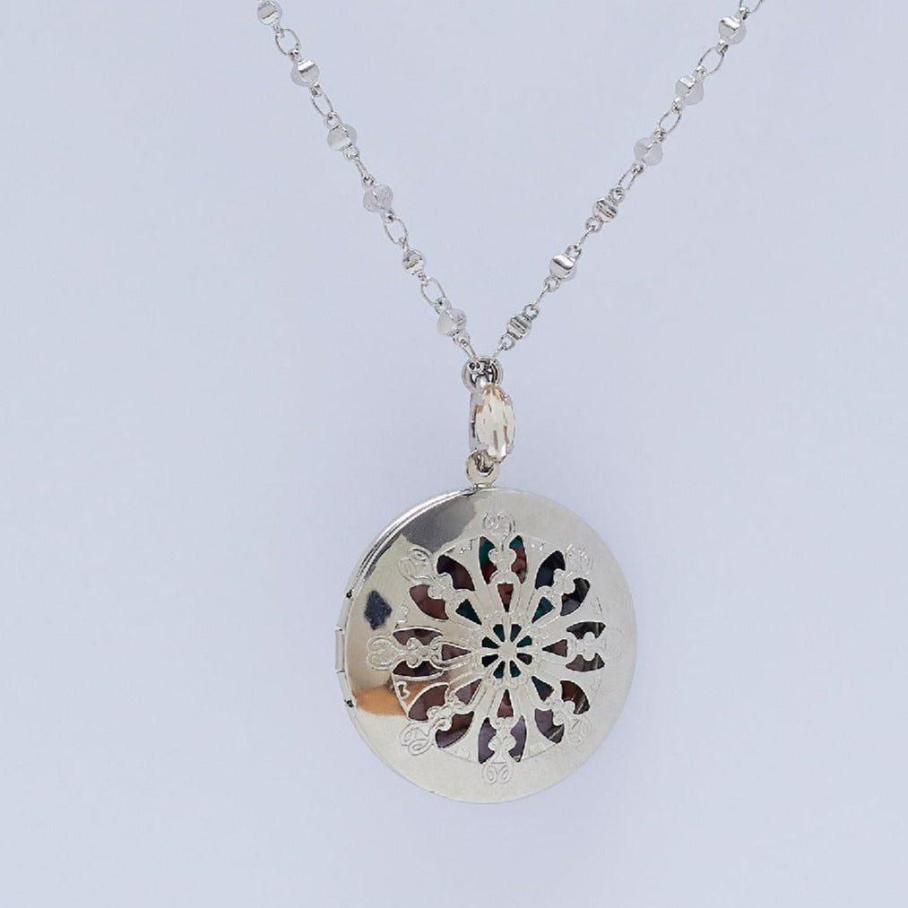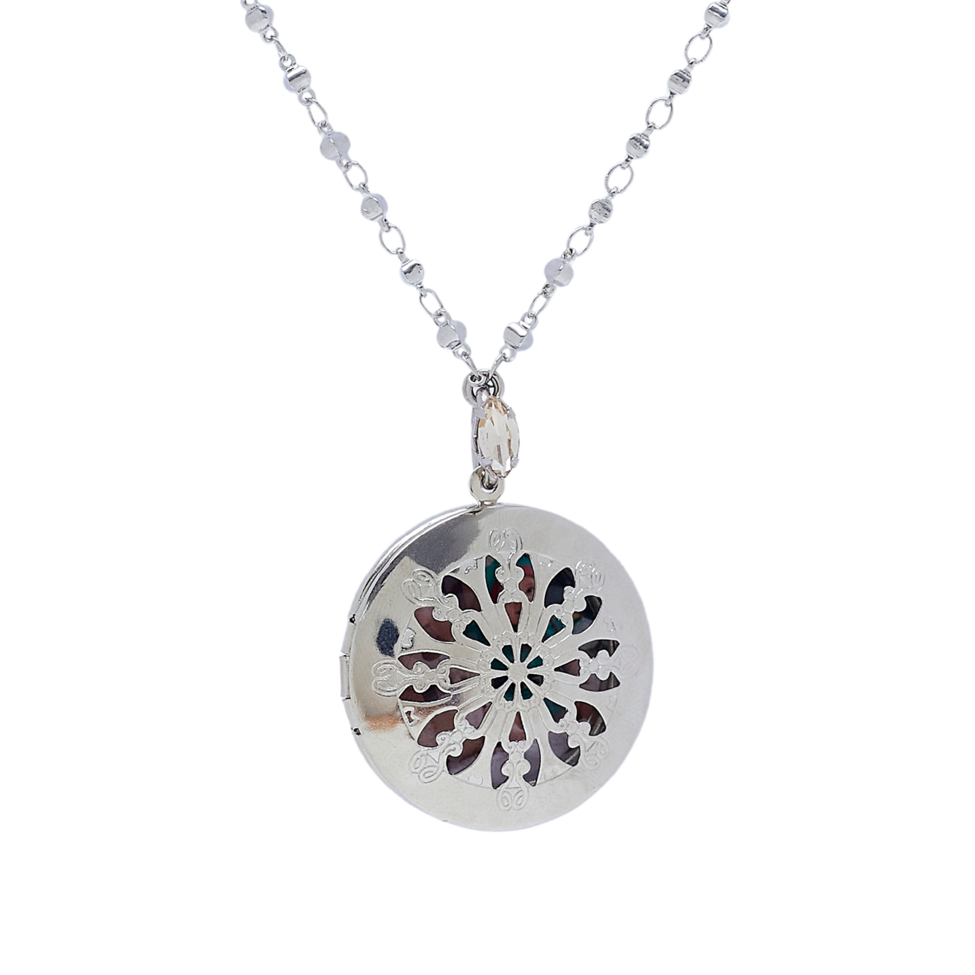 The necklace is made of brass with white rhodium plating and beige golden shadow crystal glass in detail.