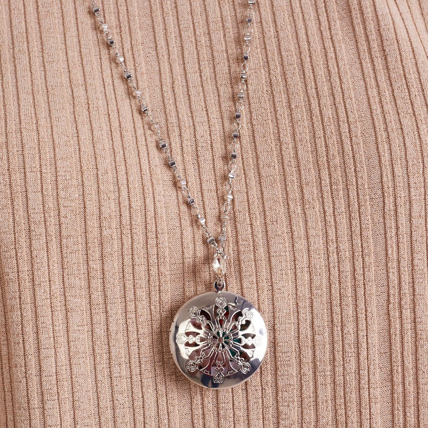 It features a beautiful design with a round pendant with floral pattern brass with gold plating.