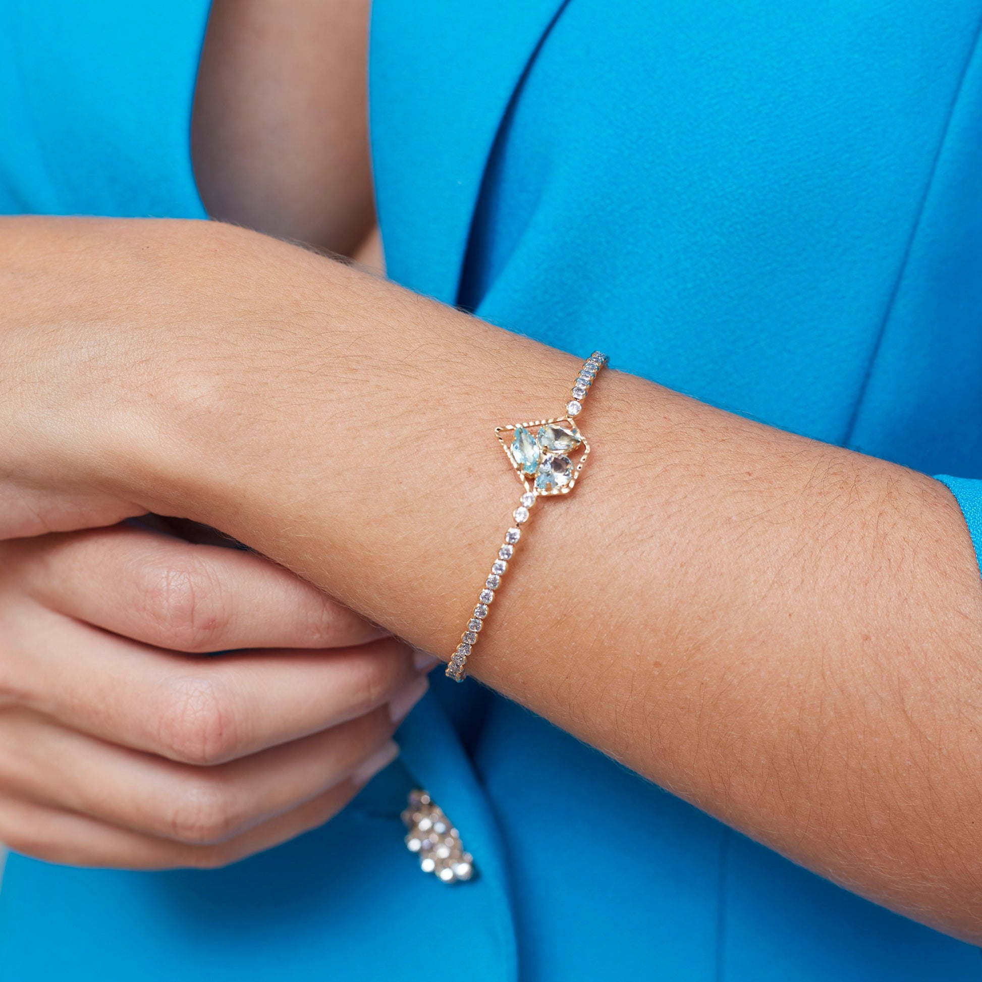 Introducing our stunning Diamond Bracelet, designed in the elegant Portuguese Riviera style. This exquisite piece features a highly glittering structure, encrusted with dozens of sparkling, colorless round crystals that catch the light beautifully. The bracelet also boasts a striking triangular pendant, adorned with a mix of gorgeous blue-toned stones.