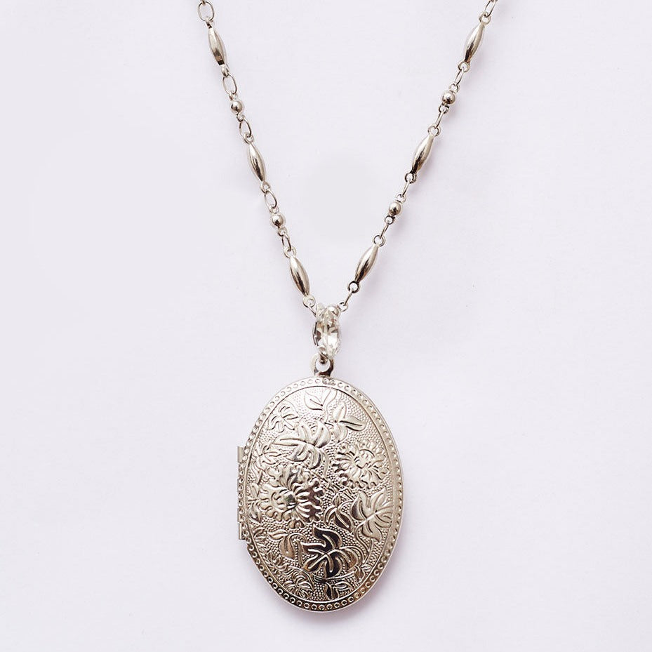 Floral Oval Locket Necklace White Rhodium Plated