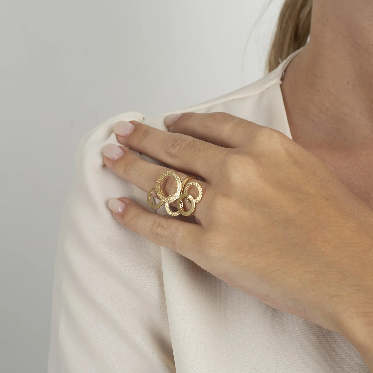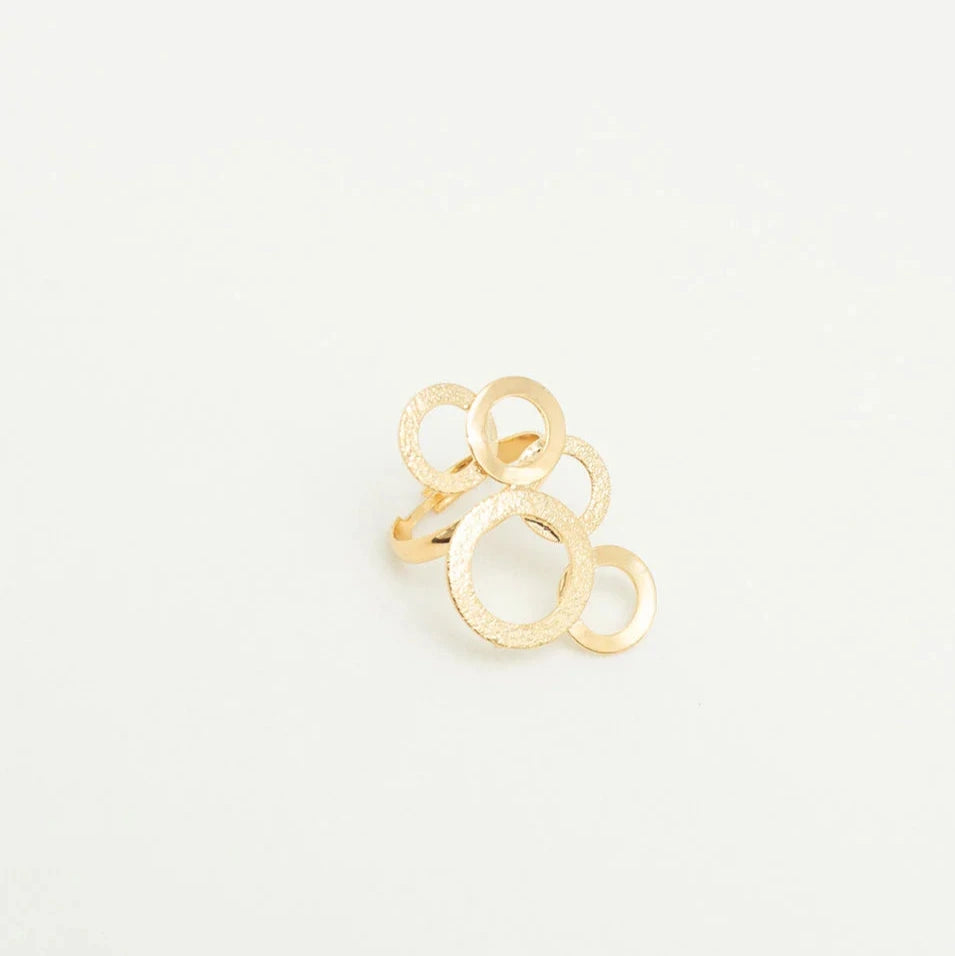 The Madox Ring from the Treasures Collection is a bold and contemporary piece, perfect for those seeking a touch of modernity and sophistication. This ring features a base composed of open circular hoops with a matte finish, offering a unique texture and a striking design.