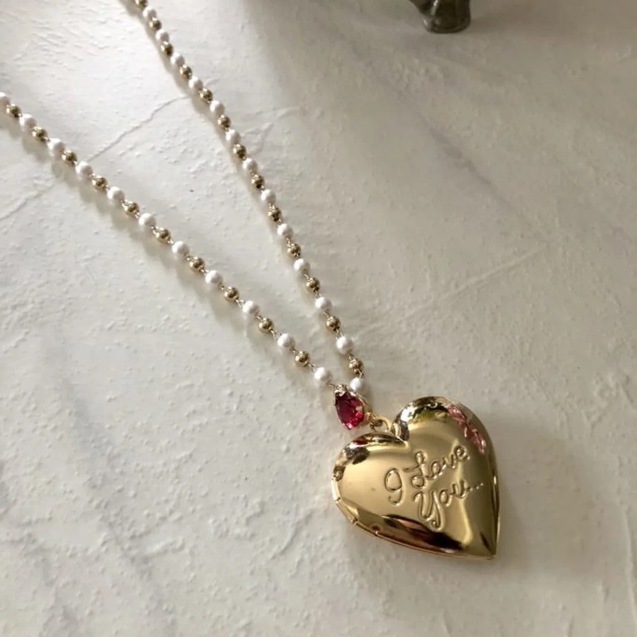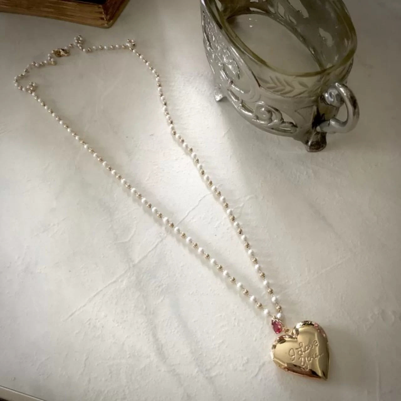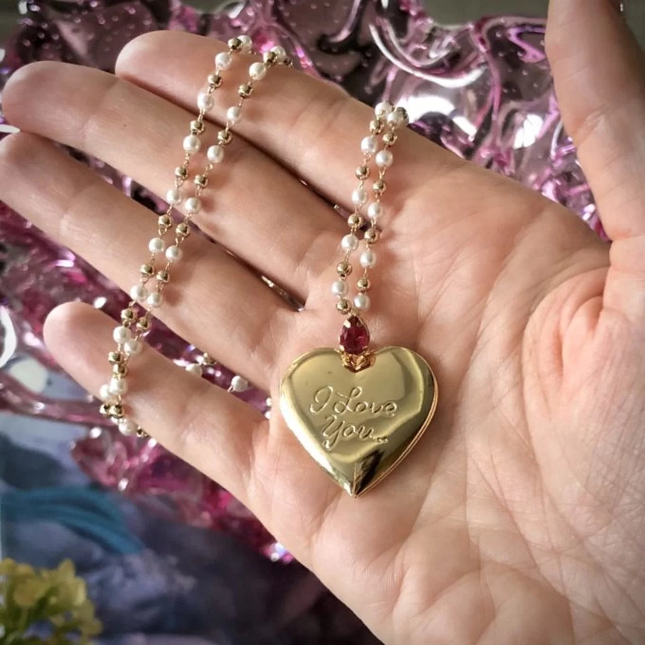 It features a heart-shaped pendant with "I love you" in bas-relief, attached to the chain of pearls and metal beads by a delicate centerpiece with a drop-shaped crystal.
