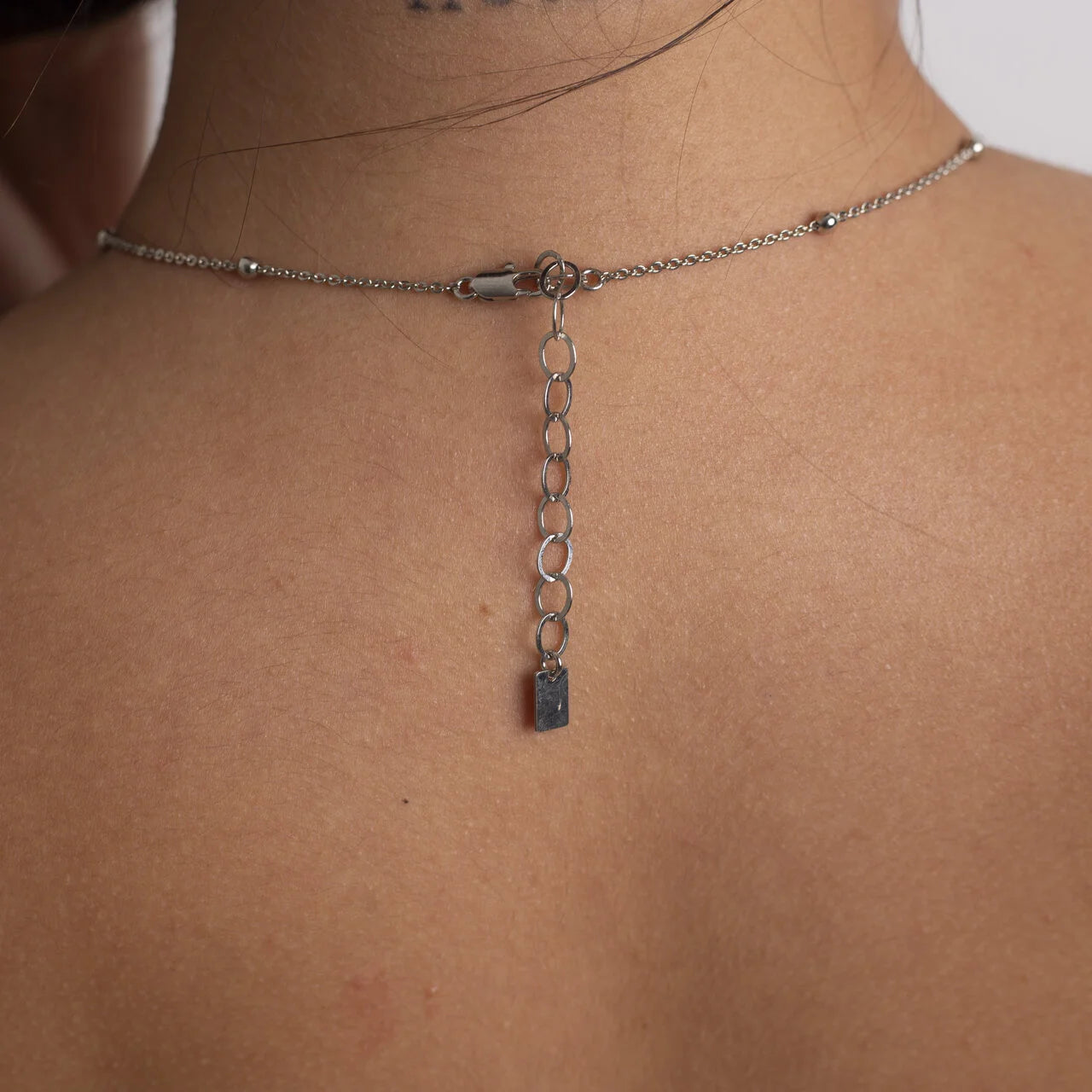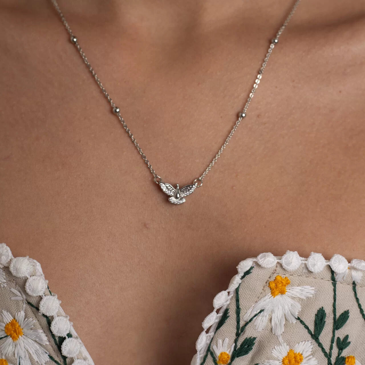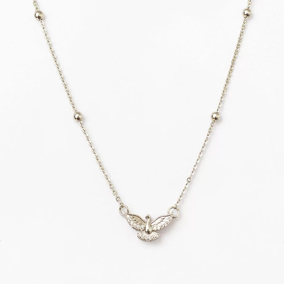 The Holy Spirit Necklace is an expression of faith and elegance. Crafted from noble metal with white rhodium plating, this necklace features a chain delicately adorned with mini beads, adding a touch of sophistication to its design.