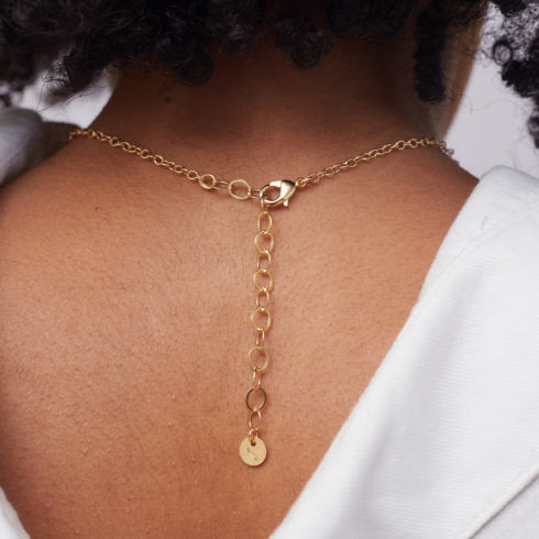 The necklace is made of brass with gold plating and clear crystal glass in detail.