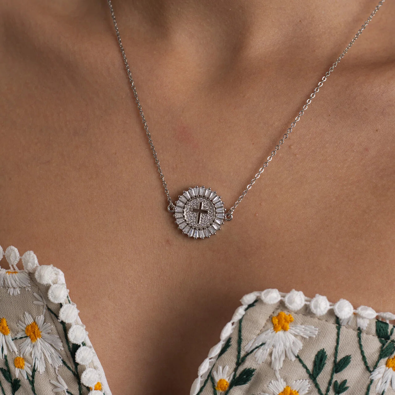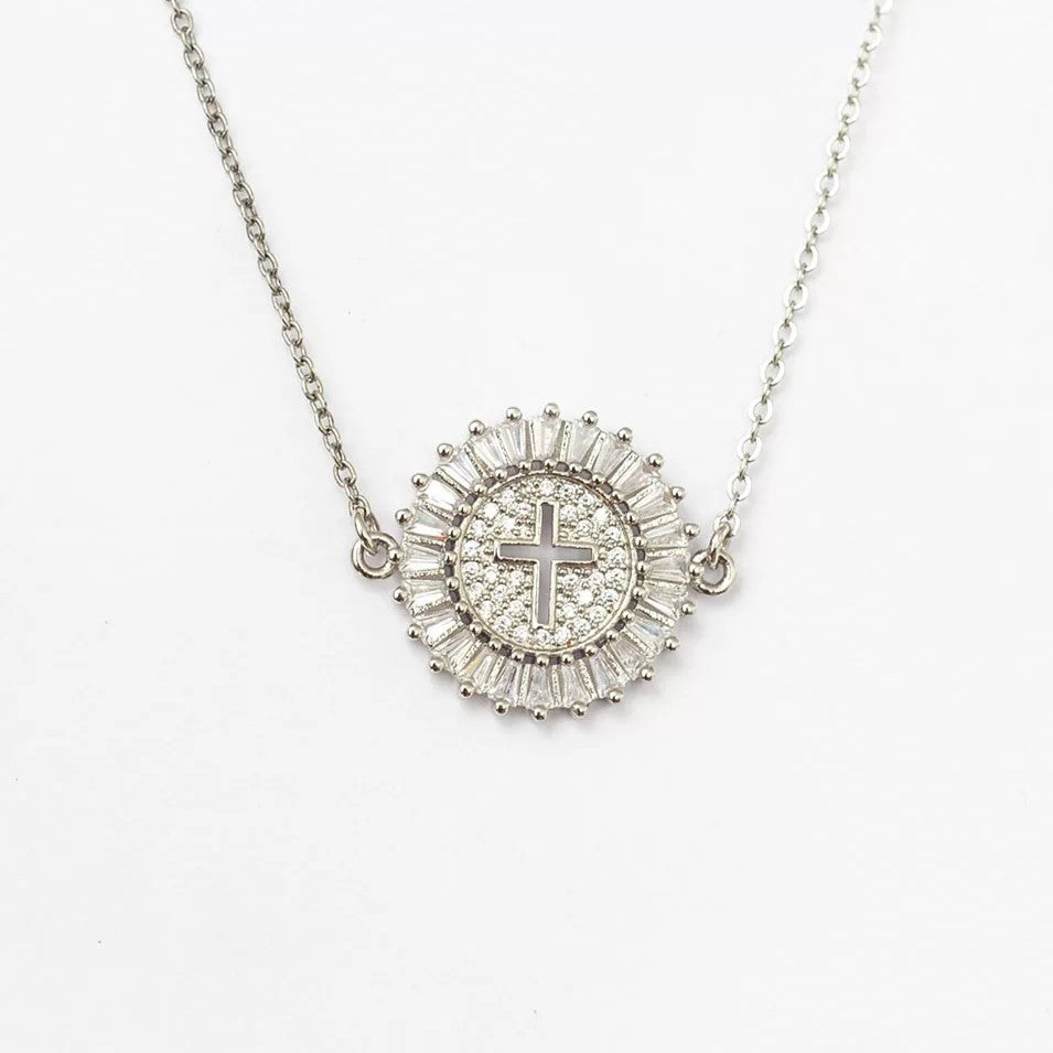 The round pendant is adorned with clear baguette zirconias, adding a touch of sparkle and sophistication to the jewelry. In the center of the pendant, a cross design adds a symbolic and meaningful element, representing faith and spirituality.