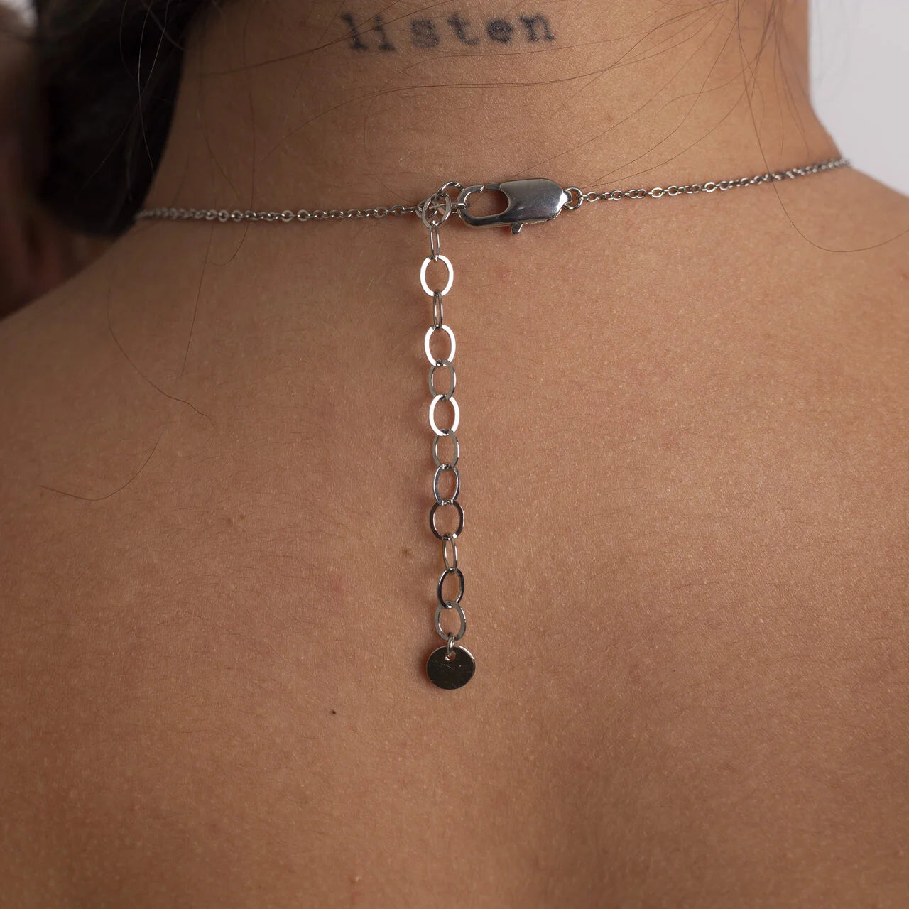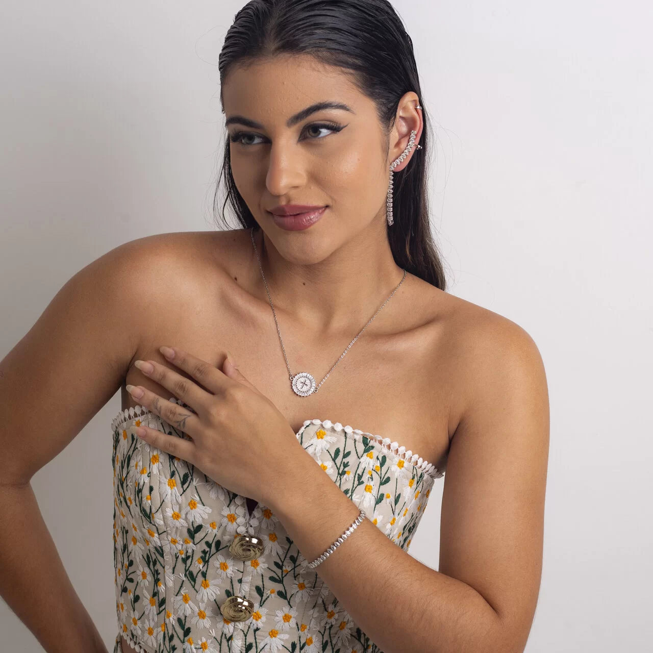The Faith Necklace is a sublime expression of elegance and spirituality. With a noble metal structure plated in white rhodium, this piece radiates a charming silver shine.