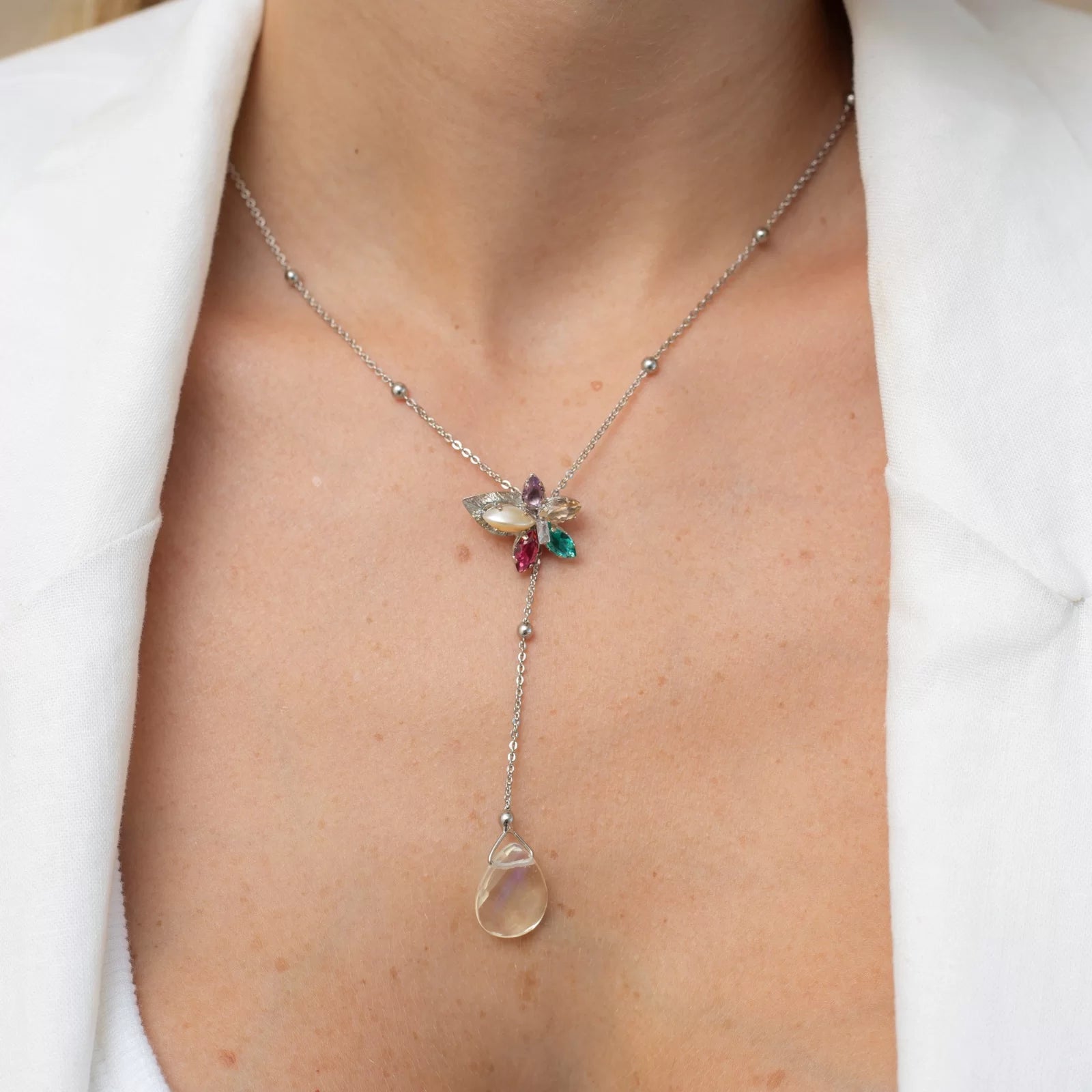 Additionally, the necklace features a clear drop crystal in white rhodium, suspended below the flower. This crystal is carefully cut to maximize brilliance and clarity, creating a unique reflective effect that perfectly complements the colorful crystals of the flower pendant.