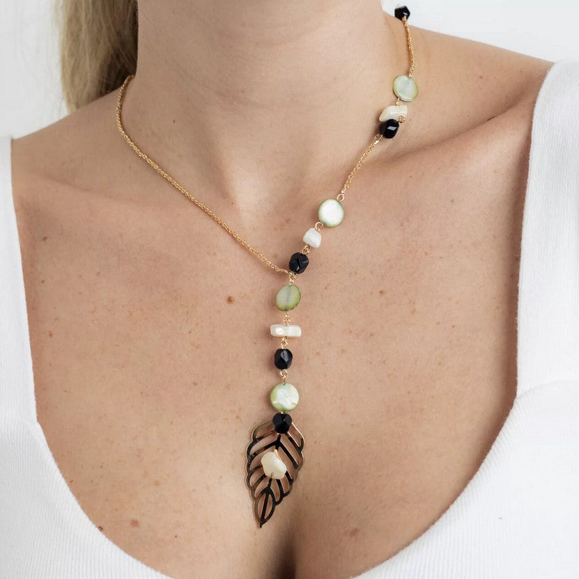 The delicate chain of this necklace is a fusion of stunning colors and textures, thanks to the meticulously selected stone embellishments. White mother-of-pearl emanates its timeless elegance, while iridescent mother-of-pearl magically captures the light, reflecting a myriad of dazzling colors. The metallic brown glass crystal adds depth and a touch of mystery to the chain.