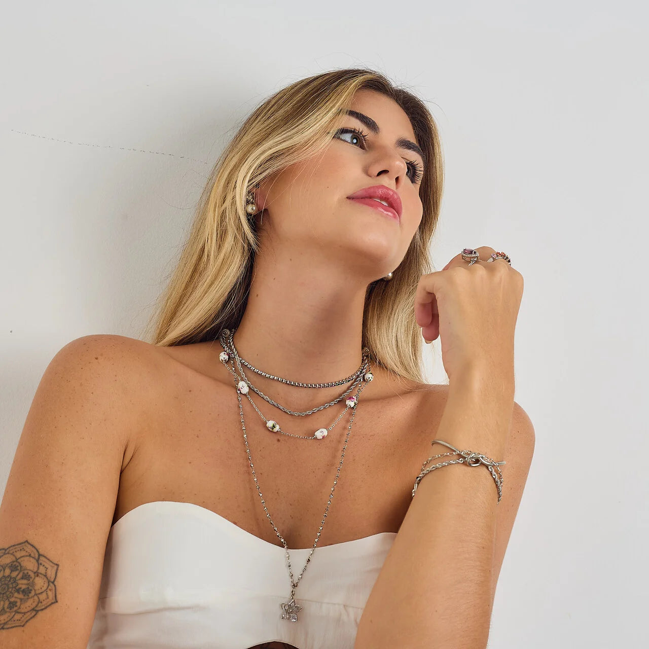 The twisted chain gives a contemporary and robust look to the piece, while the white rhodium plating provides a shiny and durable finish. Measuring 32 cm in length, this choker is designed to fit snugly around the neck, enhancing the beauty and elegance of the piece.