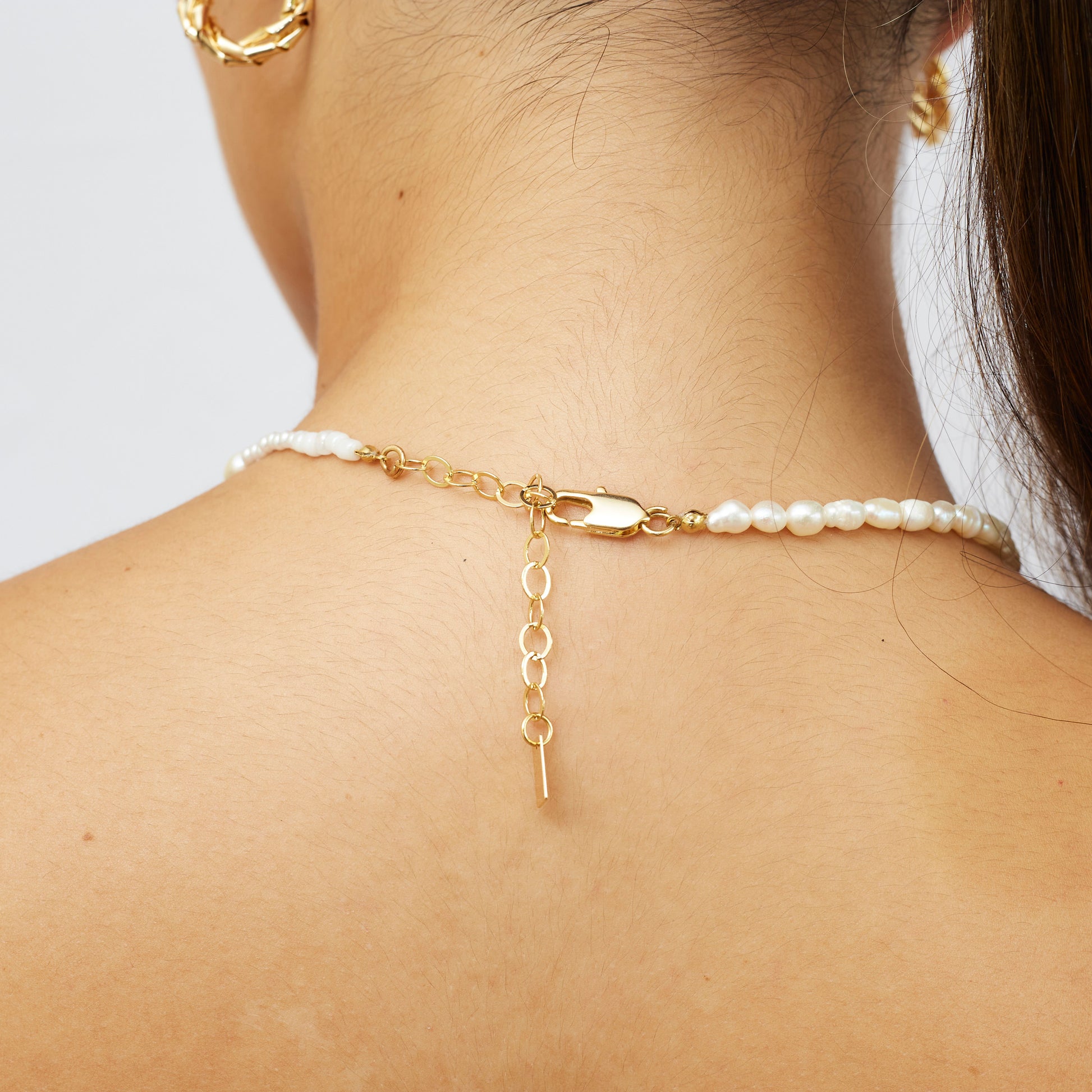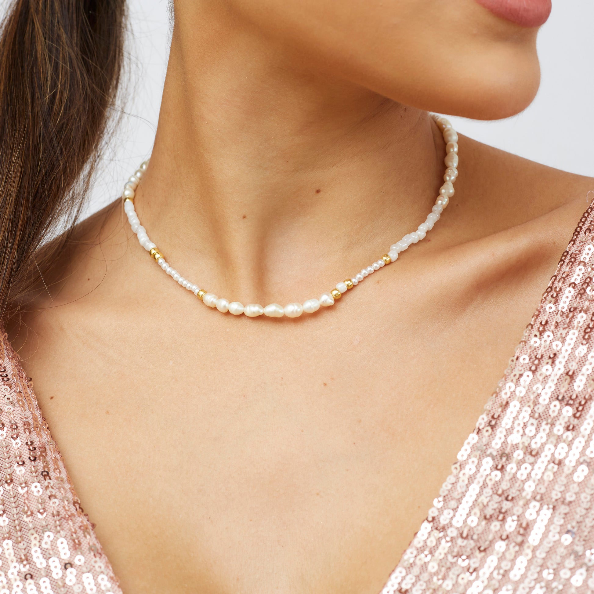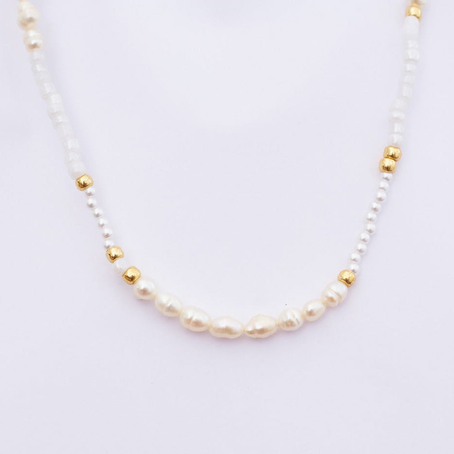 The Maldivas necklace is made with a variety of stones in shades of pearl. You will find glass beads, cultured pearls, resin and metal beads.