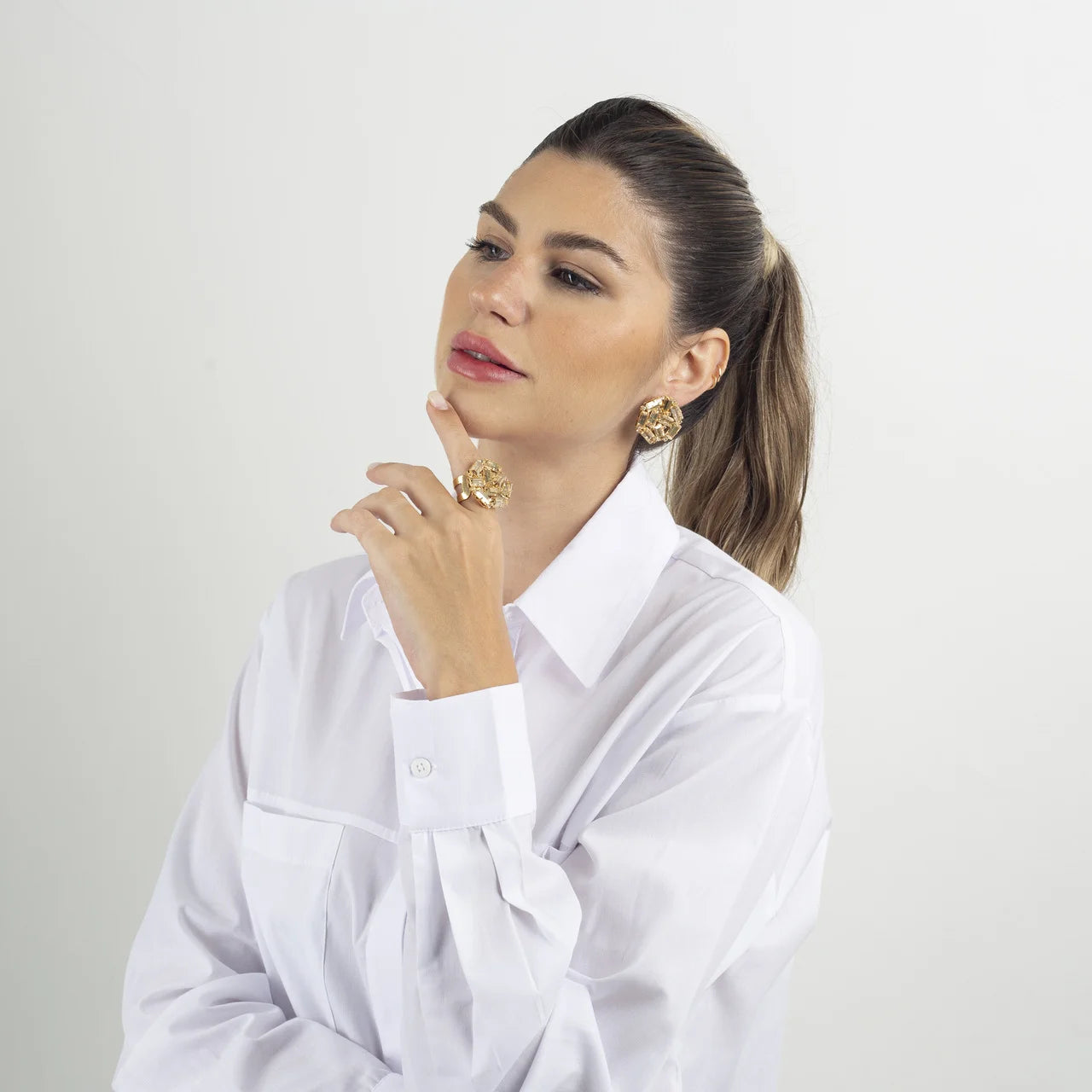 The Marilis Ring from the Tesouros Collection showcases sophisticated elegance with its round base set with champagne-colored baguette crystals, evoking the softness and brilliance of treasures found in the ocean depths. The round zircons complement the design, subtly and elegantly reflecting light.