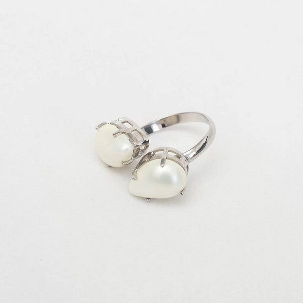MILKA PEARL DOUBLE DROP RING WHITE RHODIUM PLATED