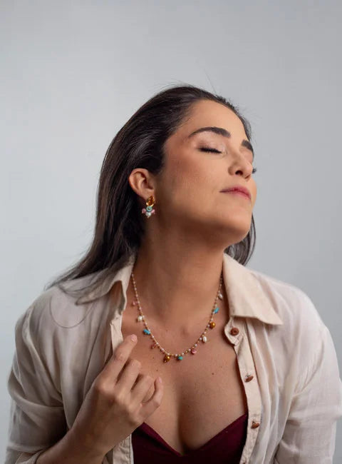 The Oasis Necklace is a piece that celebrates organic beauty and the power of natural stones. With a harmonious mix of tones and shapes, each stone carries its own story, creating a unique, vibrant composition full of personality. The gold plating enhances the details and adds sophistication, making this piece perfect for those seeking a connection with nature without sacrificing elegance.