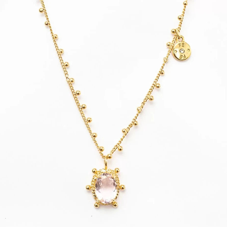 The ball chain is delicate and lightweight, offering a subtle and refined touch to the necklace. The oval pendant with applied pink crystal is the highlight of this piece, adding extra sparkle and a touch of refinement to the accessory.