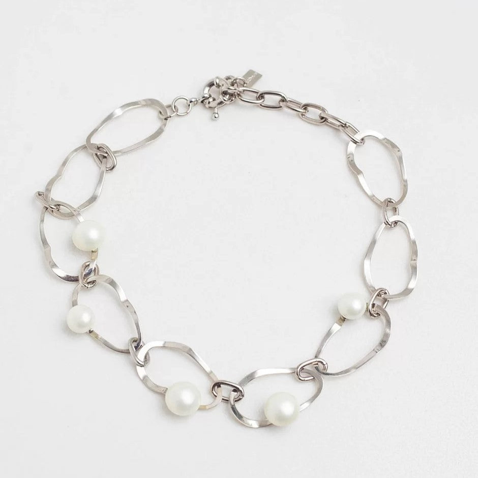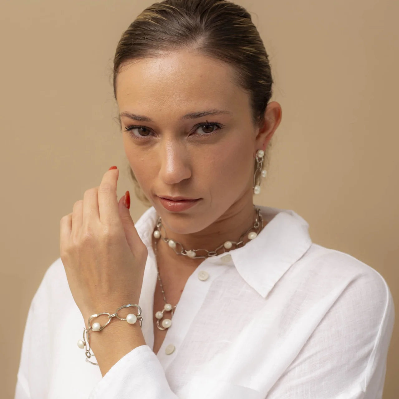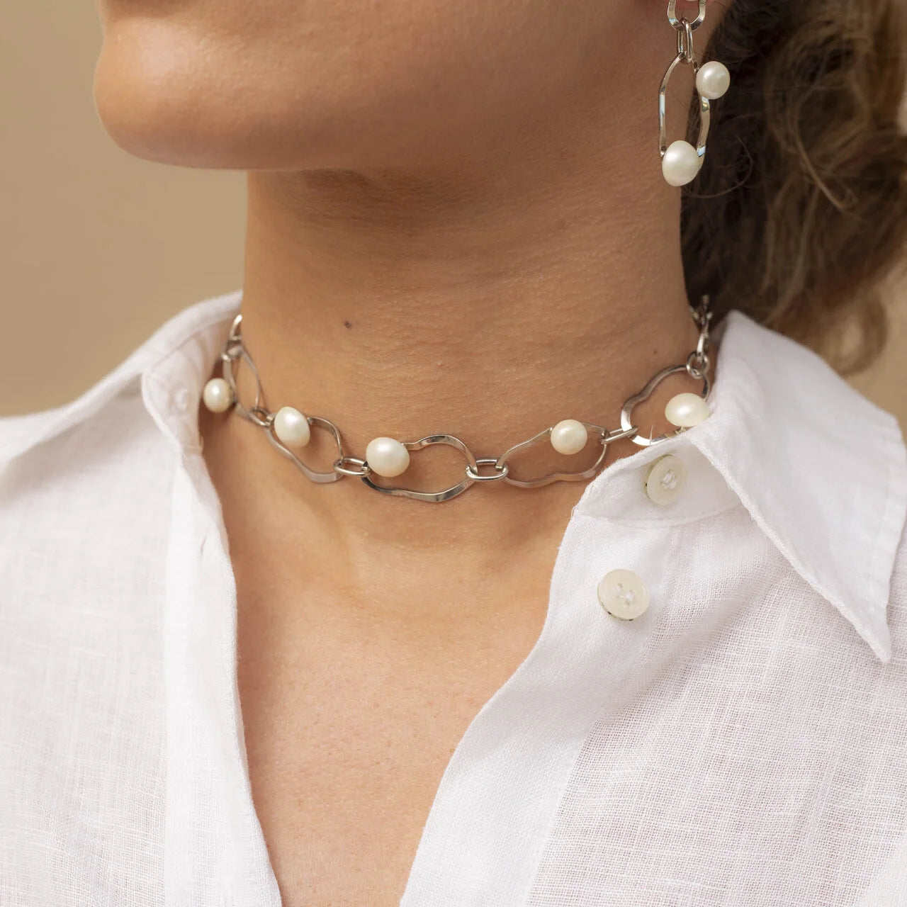 The choice of white rhodium plating gives a golden and elegant finish to the piece, perfectly complementing the white bread pearls, enhancing their natural beauty and making the necklace a standout piece of jewelry.