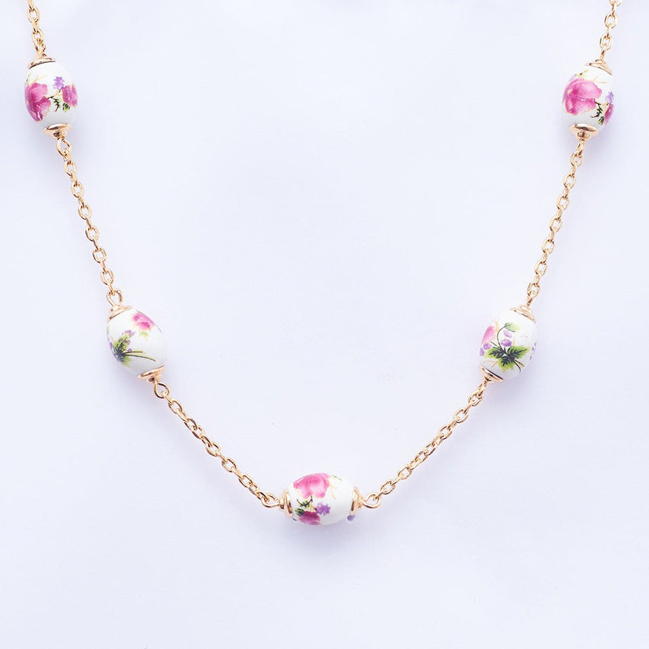 Looking for a stunning piece of jewelry? Check out our exquisite pendant necklace! Crafted from high-quality brass with a lustrous 18k gold plating, this necklace features a delicate porcelain pendants adorned with a beautiful hand-painted flower design. Measuring 52 cm in length with an additional 7 cm extender chain, it's the perfect accessory to add a touch of elegance and sophistication to any outfit. Order now and experience the perfect blend of beauty and craftsmanship!