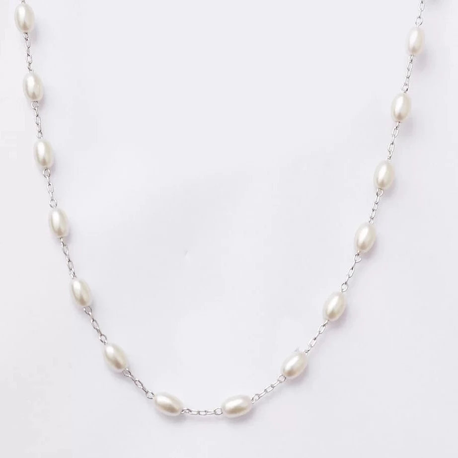 The featured Choker is crafted from a high-quality metal chain, plated with white rhodium, and adorned with rice pearls intricately set throughout its structure.