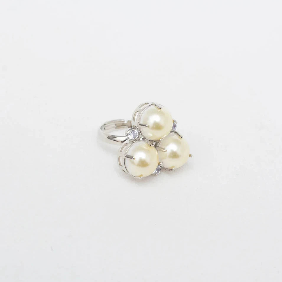 TRIANGULAR RING WITH PEARLS AND ZIRCONIA WHITE RHODIUM-PLATED