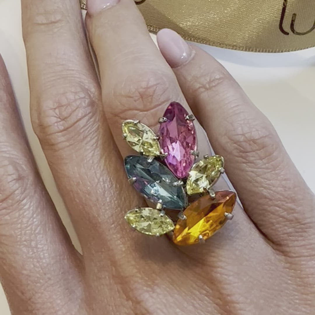 The Ring is produced by adjustable hoop, made of brass with white rhodium plating and a colorful mix of yellow and blue glass crystals and orange and pink clear resins.